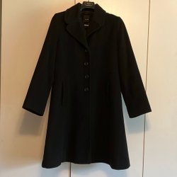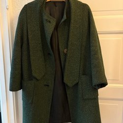 Ullkappa med huva och 5 stora knappar. Fickor fram med dragkedja samt en innerficka med dragkedja. Det står storlek 36 i kappan men den stor och rymlig i modellen, gissar på strl 40-42!