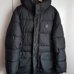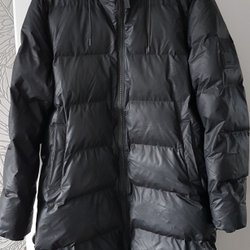 Lång, grå vadderad kappa med hög krage och tryckknappar. Kappan har en rak passform och är perfekt för kyligare dagar.