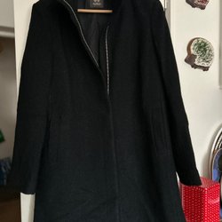 Elegant svart kappa frå h&m med huva och knyt band i midjan. Kappans design har en modern och stilren look, perfekt för både vardag och festligare tillfällen. Den har en unik asymmetrisk nederkant som ger en extra touch av stil.