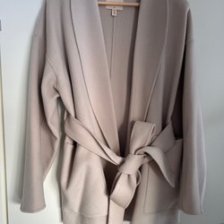 Elegant kappa från H&M. Den har en klassisk dubbelknäppning, bred krage och ett justerbart bälte i midjan för en smickrande silhuett. Perfekt för både vardag och fest.