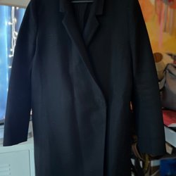 Elegant svart kappa med pälskrage och detaljer vid ärmarna. Kappan har en dubbelknäppning med guldfärgade knappar och en klassisk passform.