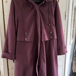 Vinröd kappa med huva och dragkedja framtill. Kappan har en stilren design och en bekväm passform.