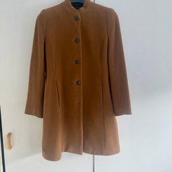 Gråmelerad kappa med huva och detaljer i svart fuskpäls. Kappan har dragkedja och tryckknappar framtill.