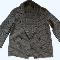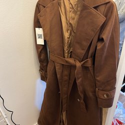 En kappa i en ljusare nyans med detaljer i form av fuskpäls vid krage och ärmslut. Kappan har en knäppning framtill med dekorativa knappar och ett band i midjan för att justera passformen.
