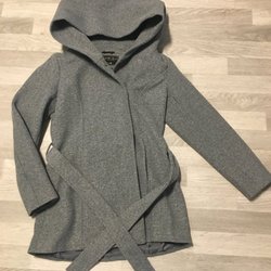 Gråmelerad vår/ höst kappa med krage, knäppning framtill och långa ärmar. Kappan har två fickor fram och en slits nedtill på sidan.