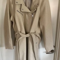 Beige kappa med en unik design. Kappan har en krage och knappar framtill. Den har ett rutigt mönster med dekorativa sömmar.