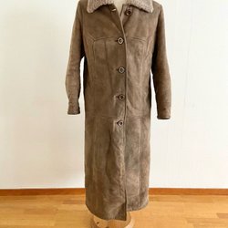 En brun kappa med huva och fuskpälsdetaljer. Kappan har knappar framtill och en rak passform. Använd några gånger har extra knapp storlek L. Mycket bra skick.