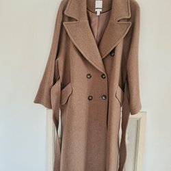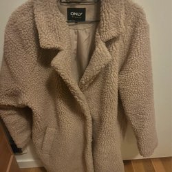 En ljusgrå/beige kappa med knappar framtill. Den har en hög krage och en avslappnad passform.