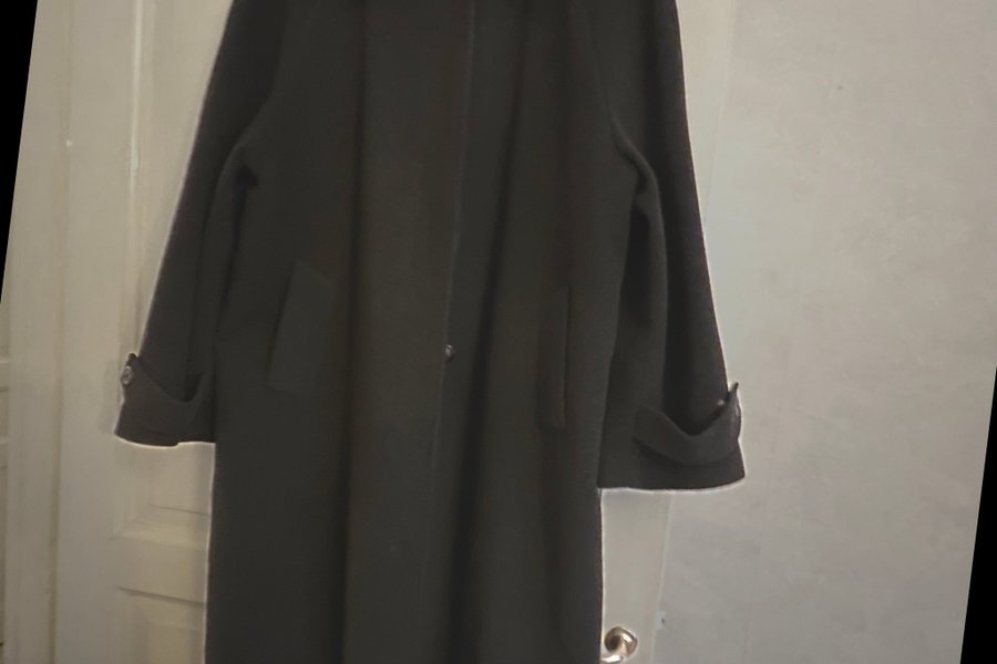 En lång svart kappa med klassisk krage och knäppning framtill. Kappan har fickor på sidorna och ärmslut med knappar.färgen grå svart.jag har aldrigt använt .