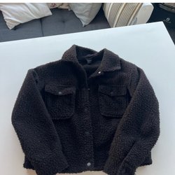 Fin filtjacka/ kappa. Noppig och lite ludd men fin. Finns hällor men inget bälte.