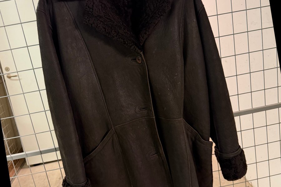 En svart kappa med en krage och muddar i ett mjukt, lurvigt material. Kappan har knäppning framtill med tre knappar och två fickor i midjehöjd. Sömmarna är diskreta och kappan har en slät skinn yta.