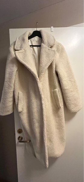 Lång kappa i teddytyg med slagkrage och fickor framtill. Kappan har en rak passform och är lämplig för kallare väder.