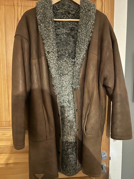 Brun fårskinnskappa med grå lockig krage och foder. Knäppning framtill. varm och skön, design uppsydd