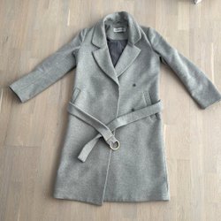 Elegant ljusgrå kappa med dubbelknäppning och en unik krage med dekorativa detaljer. Kappan har en klassisk silhuett och praktiska detaljer som dekorativa fickor.