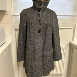 Långärmad kappa med ett svart och vitt rutmönster. Kappan har två bröstfickor och knäpps med knappar. Nypris 600 kr