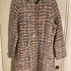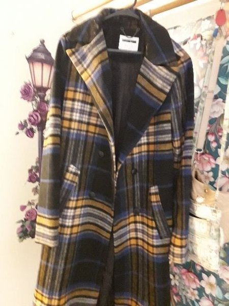 En rutig kappa med en klassisk design. Kappan har en dubbelknäppt front och fickor i sidorna. Mönstret består av rutor i olika färger som ger ett stilfullt intryck. Kragen är bred och slagen, vilket bidrar till kappans eleganta utseende. Stl.38