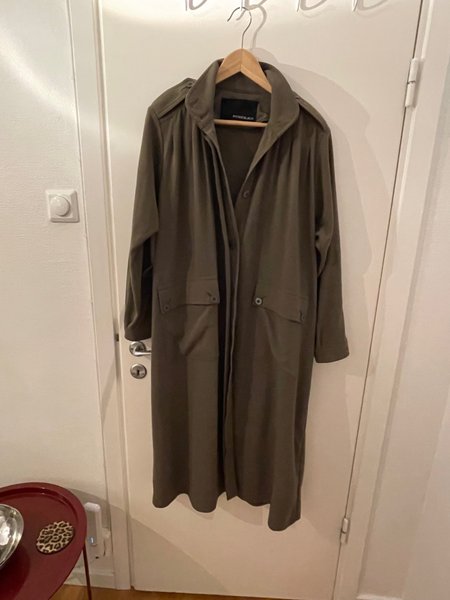 Lång kappa i en mörkgrön nyans med knäppning framtill. Kappan har en klassisk krage och två fickor med lock framtill. Ärmarna är långa och raka.