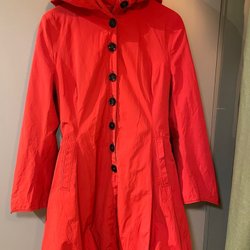 Elegant röd kappa med dragkedja och detaljer på ärmarna. Perfekt för att hålla värmen med stil.