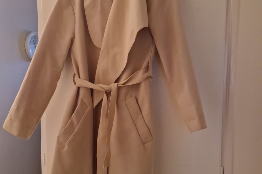 Beige kappa med knytskärp i midjan och två fickor framtill. Kappan har en öppen design utan knäppning och en bred krage som faller snyggt. Ärmarna är långa och raka.