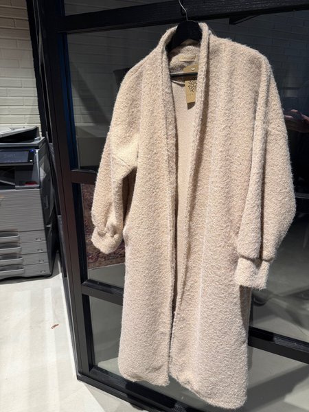 Lång kappa i en neutral färg som passar till många olika outfits. Kappan har en öppen design utan knäppning och långa ärmar med en avslappnad passform. Den är tillverkad i ett mjukt och texturerat tyg som ger en mysig känsla. Perfekt för lager-på-lager eller som ett värmande plagg under svalare dagar.
