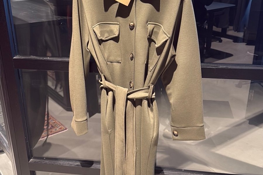 har en krage och knäppning framtill med knappar. Midjan markeras med ett knytband i samma tyg. Klänningen har två bröstfickor med lock och knappar samt långa ärmar och en knapp vid ärmsluten. En etikett hänger från kragen.