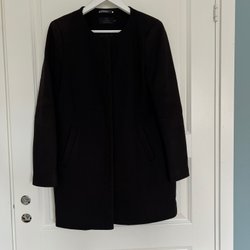 Svart kappa med huva. Kappan har en enkelknäppning framtill och en rak passform.