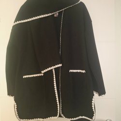 Svart kappa med huva och fuskpälsdetaljer. Kappan har ett knytband i midjan och två fickor framtill.