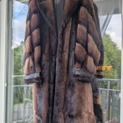 Brun minkpäls med huva från Italien. Modellen är något längre på ryggsidan än på framsidan. Använd ett fåtal gånger. Mycket bra skick, se bilder.