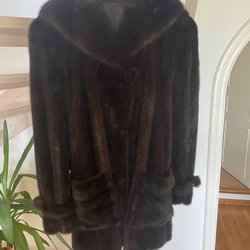 Elegant brun pälskappa med lång modell och klassisk krage. Jackan har en tidlös design som passar perfekt för både vardag och fest. Kappans material är av minkpäls. Kappan är välskött och i fint skick. Den är omsydd och namnmärket finns inte tillbakasytt på fodret. En förändring i färg på fodret visar var märket har suttit.