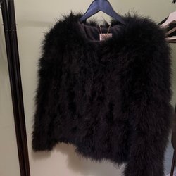 Elegant och mjuk och tjock Leopardjacka med 3/4-ärm, en knapp framtill. Mycket gott skick förutom en liten trådreva i fodret, se sista bilden. Saknar lappar, uppskattar den till S-M, se mått: