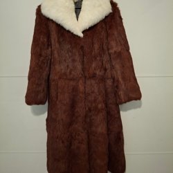 Röd äkta kanin päls kappa. Det står ingen storlek i den men jag uppskattar den till en S/M. Se måtten och jämför med någon kappa som du har hemma för att vara säker på att den passar. Armhåla till armhåla ca: 47cm, Längd ca: 68cm. Fint skick. Slitage vid ärmsluten.