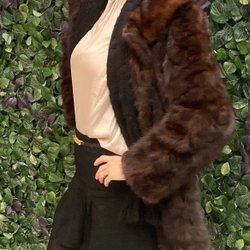Brun äkta pälsjacka med krage och hyska och hake-knäppning. Jackan har ett brunt foder och fickor. Kan bäras med kragen upp eller nedfälld. Köpt second hand så vet ej märke. Storlek framgår ej men passar mig som är small.