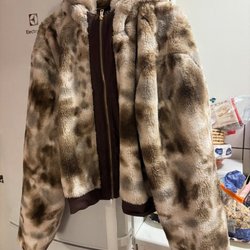Färgglad jacka med dragkedja framtill. Jackan har ett mönster med blåa, bruna och svarta ränder.