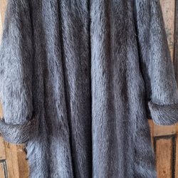 Brun jacka med luva och pälskrage. Jackan har dragkedja och knäppning framtill.
