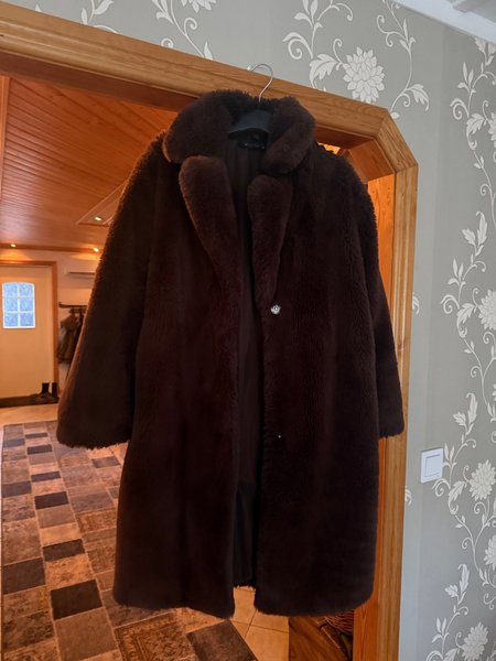 Brun fuskpäls kappa med krage och knäppning framtill. Perfekt för att hålla värmen under kyliga dagar.