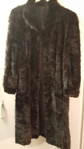 Elegant brun minkpäls med knäppning framtill. Perfekt för att hålla värmen under kalla dagar.