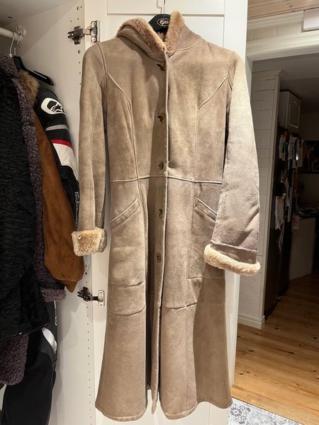 Lång kappa med huva och knäppning framtill. Kappan har detaljerade sömmar och fickor fram.