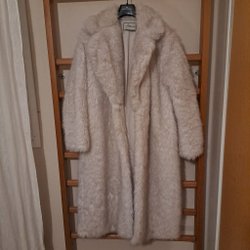 Lång pälsjacka med krage och långa ärmar. Jackan har en rak passform och når ner till knäna. Den har en fyllig textur och en naturlig färgvariation.St 38 längd 120cm byst 110 cm