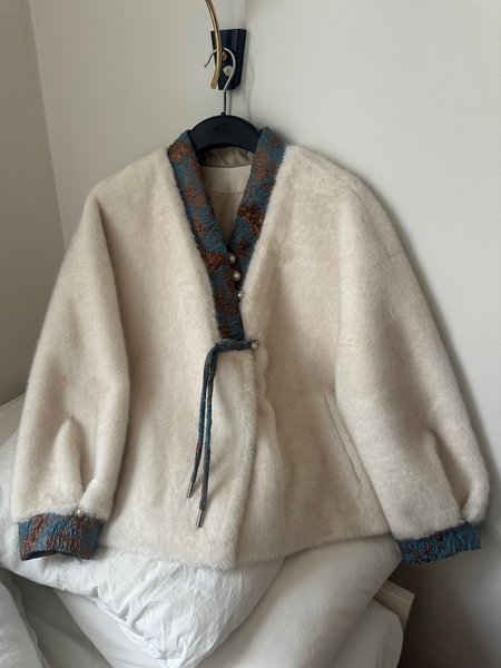 En vit jacka med detaljer i blått och brunt vid krage och ärmslut. Jackan har en lös passform och knäpps med snören framtill.