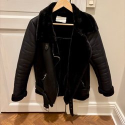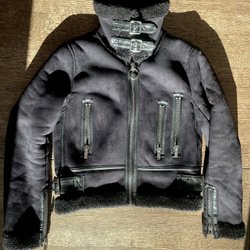 Svart jacka med dragkedja och detaljer i silverfärg. Jackan har en krage med fuskpäls.