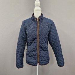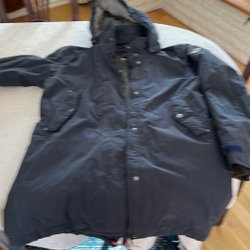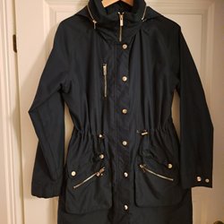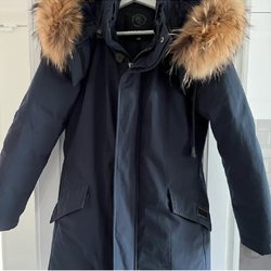 Mörkblå jacka med dragkedja och knappar framtill. Jackan har en avtagbar huva med fuskpäls. Det finns dragsko i midjan och nedtill för justerbar passform. Två fickor fram med knappstängning. Fint skick knappt använd. Kommer från rök och djurfritt hem.