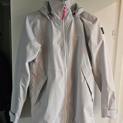 Jättefin vit jacka från Didriksons i stl 38. 100% polyamid, 100% polyester. Vindtät och vattentät. Avtagbar luva.