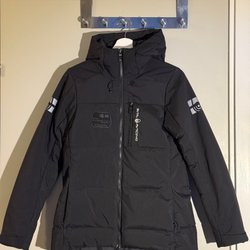 Svart Sail Racing dunjacka med huva. Jackan har flera fickor och en patch på ärmen med texten "Sail Antarctica Expedition".