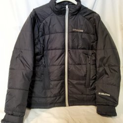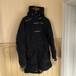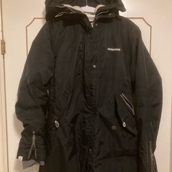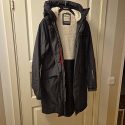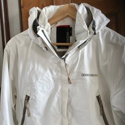Vit vinterjacka med dragkedja och tryckknappar framtill. Jackan har en avtagbar huva med fuskpäls. Det finns flera fickor på framsidan.