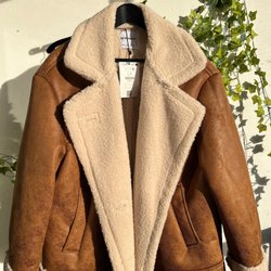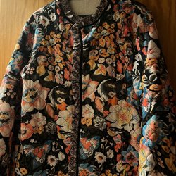 Mörkblå vadderad jacka med huva och dragkedja framtill. Jackan har även fickor med dragkedja. Sammetsliknande material.