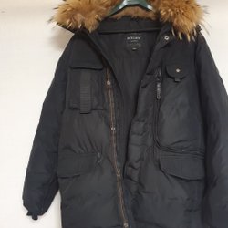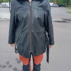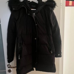 Svart holliesjacka med dragkedja och knappar framtill. Jackan har äkta päls på huvan och flera fickor.
