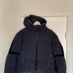 Blå Moncler dunjacka med hög krage och dragkedja fram. Jackan har två fickor med dragkedja fram.