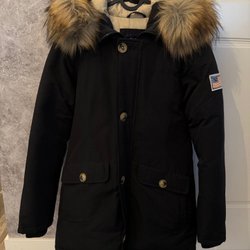 Svart vinterjacka med stor pälskrage från Svea. Jackan har en amerikansk flagga på ena ärmen och guldiga knappar. Jackan i storlek S
