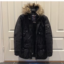 Fickor med dragkedja, en innerficka och avtagbar luva (även pälskanten är avtagbar), se bild. Går att dra åt i ryggen och nertill om så önskas. Väger inte så mycket, så är lätt att bära.