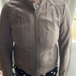 Beige jacka med långa ärmar, krage och knappar framtill. Jackan har två bröstfickor med knapp.